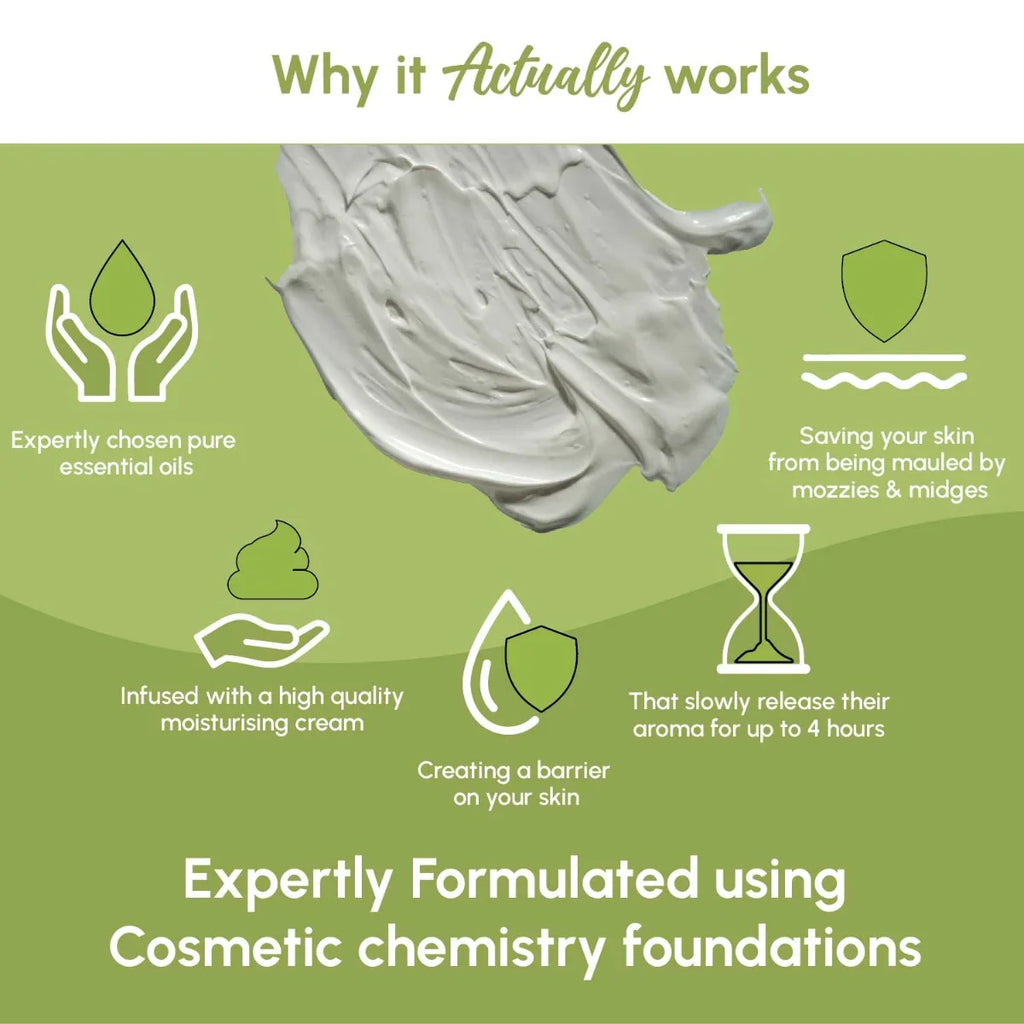 The cream utilizes a combination of shea butter and beeswax to deeply nourish and protect the skin from midges and sandflies, while still maintaining a non-sticky and non-greasy feel. Compared to sprays, it also prolongs the longevity of essential oils on the skin, reducing the frequency of reapplication.