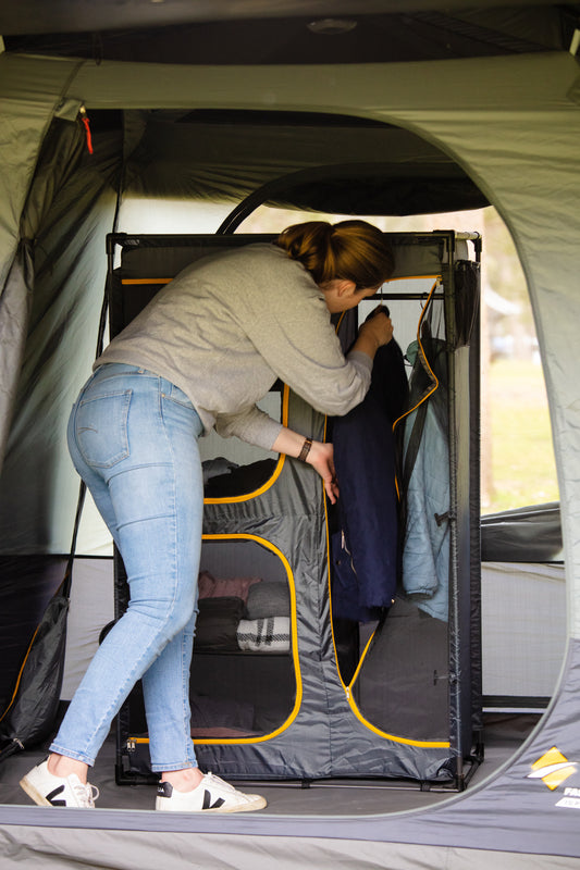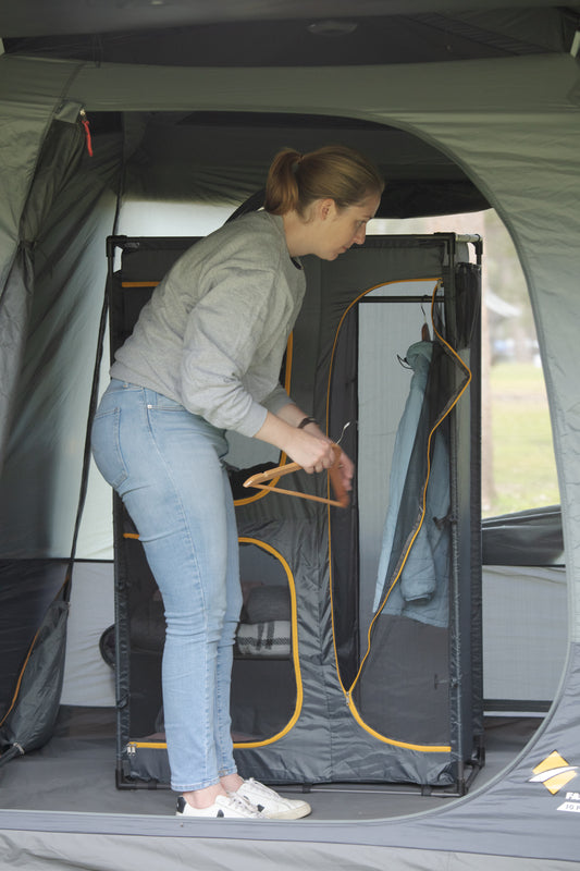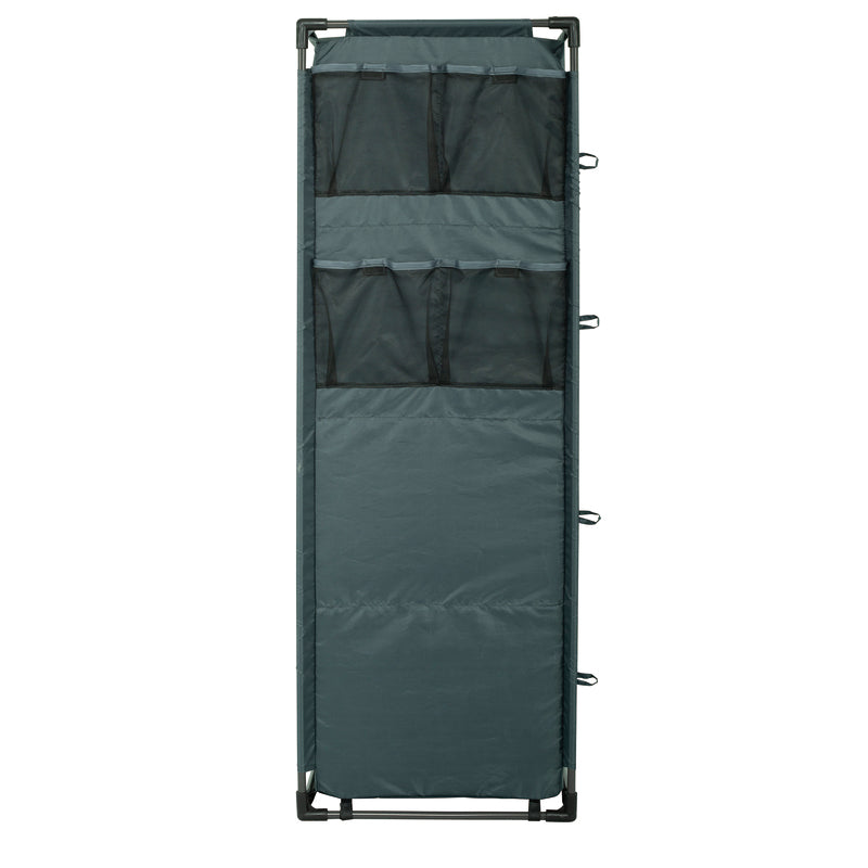 This versatile wardrobe provides ample space to store clothes and accessories on the four shelves and hanging space. The zippered doors and mesh ventilation make it easy to access your belongings, and the sturdy steel frame and durable Oxford polyester skin ensure a reliable structure. The wardrobe is lightweight and packs down flat into a bag provided, and the handy side mesh pockets offer extra storage for small items such as keys and torches.