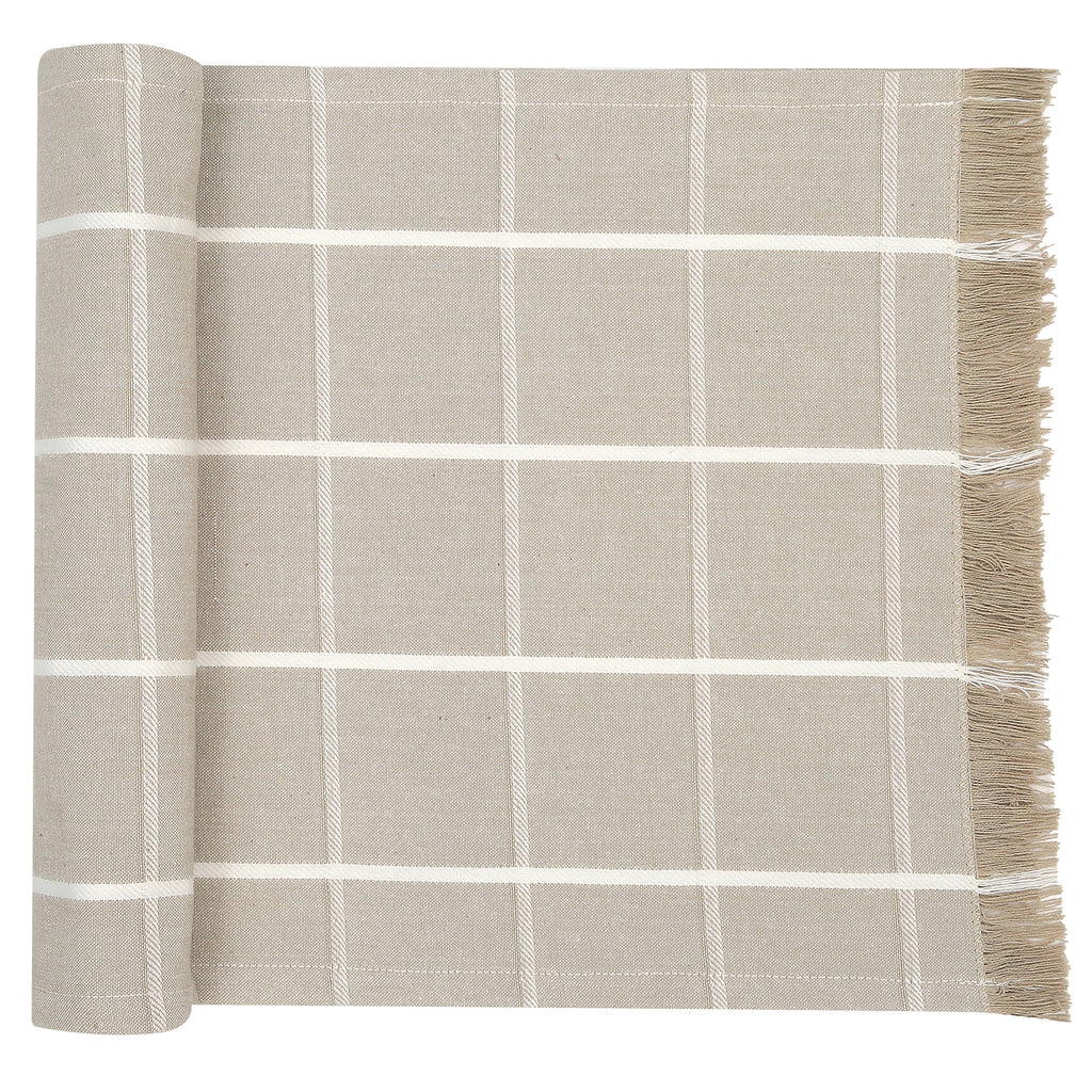 Add a refined touch to your table with this 100% cotton table runner in a timeless taupe and cream check design. Measuring 35 x 180 cm, it’s the perfect length for both everyday dining and special occasions. Durable and preshrunk to minimise shrinkage, this runner is crafted in India with quality and longevity in mind. The soft tones and subtle fringe detail offer a relaxed, elegant look that complements any décor.